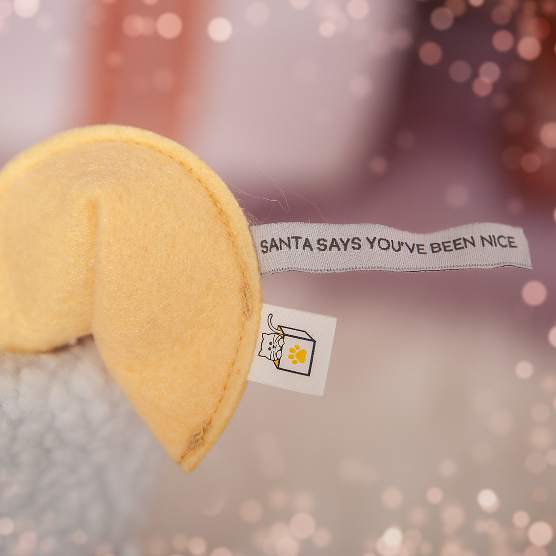 Included in the set are three toys: a crinkly maple leaf (red on one side, orange on the other) made of felt, an adorable felt fortune cookie with a fortune that reads, "Santa says you've been nice," and a fish made of red holiday fleece fabric with ribbons. One of the ribbons is stamped with a holiday message, "Meowy Christmas."